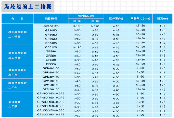 备 注:1、我公司生产的土工格栅常规网眼尺寸为12×12mm和20×20mm;2、常规幅宽为2m、4m和6m。