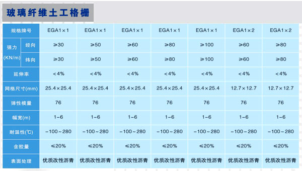 玻璃纤维土工格栅是一种增强路面及路基的新型优良土工基材,该产品采用优质增强型无碱玻璃纤维纱,引进国外先进的经编机织造而成。具有横纵向很高的抗拉强度,低的延伸率,高的弹性模量,耐高低温性能优良等特性,经表面涂覆处理后,具有优良的抗碱性能及耐老化性能,广泛应用于沥青路面,水泥混凝土路面及路基的增强,无论硬性路面和柔性路面皆可适用,与传统路面比能降低造价,延长寿命,防止道路裂纹反射而引起路面裂缝等。该产品亦可用于铁路、机场、水利、堤坝等软土的增强及路基层的增强。